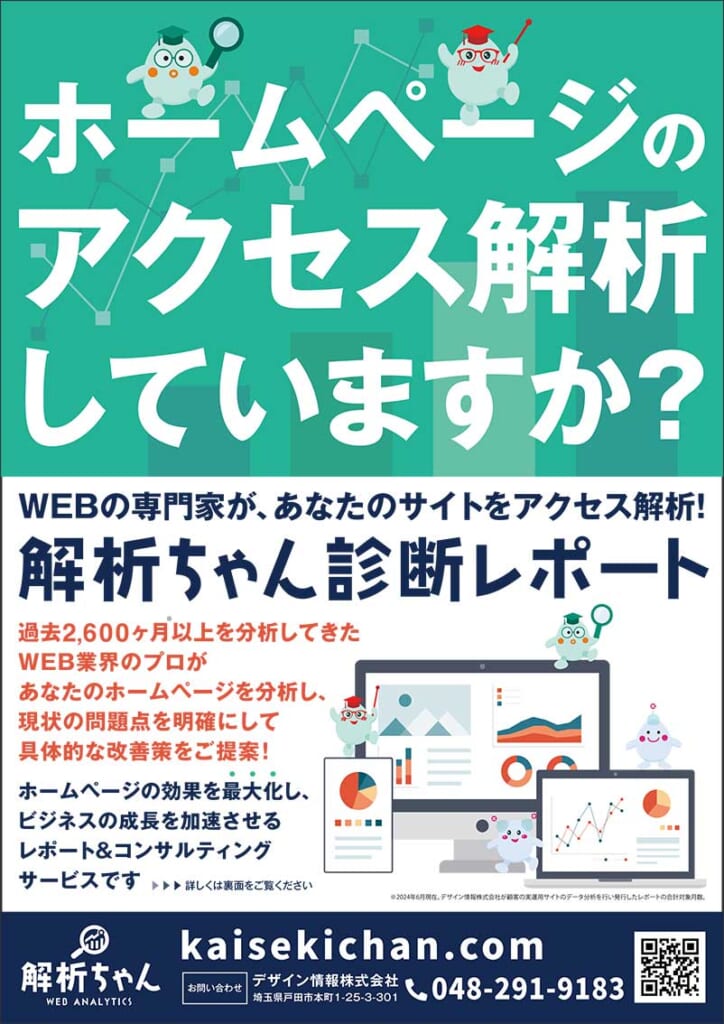 解析ちゃん診断レポート(以下「当サイト」)を提供するデザイン情報株式会社(以下「当社」)は、以下のとおり免責事項及び個人情報保護方針を定め、質の高い情報提供とご利用者の個人情報の保護に取り組みます。 ■免責事項 当サイトで提供している情報及びレポートで配信される情報は、ご利用者のご判断・責任でご使用ください。当サイトでは、できるだけ正確な情報の提供を心掛けておりますが、提供した内容に関連して、ご利用者が不利益等を被る事態が生じたとしても、当サイト及び当サイト関係者は一切の責任を負いかねますので、ご了承の上ご利用ください。 ■個人情報保護方針 当サイトにおいて、ご利用者自身のご判断により個人情報をご提供いただく場合がございますが、その情報は必要最小限の情報とし、その他の情報のご提供につきましてはご利用者の判断を尊重いたします。当サイトはご利用者の個人情報の取り扱いに細心の注意を払い、個人情報の保護に取り組みます。 ■個人情報の取得と利用目的 当サイトでは、ご利用者に当サイトをご利用いただくにあたり、必要最小限の個人情報をいただく場合がございます。ご利用者からご提供いただいた個人情報は、ご利用者がご利用になるサービス及び、ホームページのユーザビリティの改善など、当社の活動の範囲内に限り使用させていただきます。むやみに不必要な広告を送ること等がないよう情報の質の向上に取り組みます。尚、個人情報をご提供いただく際に、利用目的が別途明示されている場合は、そちらの内容に従い利用させていただきます。 ■クッキー等の取得と利用目的 当サイトでは、ホームページ閲覧動向を把握するため、クッキーなどの個人が特定できないアクセス情報を収集する場合があります。サービス向上のためのアクセス解析を目的として使用させていただきますが、アクセス情報の提供を許可しないご利用者は、ブラウザの設定などで収集をブロックしてご利用ください。 ■個人情報の管理・保護 当サイトは、ご利用者からご提供いただく際にはSSL(暗号化通信)を使用し、ご提供いただいた個人情報は適切な方法で管理し、個人情報の紛失や漏洩などが起きぬよう必要な対策を講じます。 ■第三者への提供の禁止 当サイトが、ホームページ上でご利用者よりご提供いただいた個人情報は、次のいずれかに該当する場合を除き、ご利用者の事前の了解なく第三者に提供・提示されることはありません。 ご利用者が希望されるサービスを行なうために当社が業務を委託する業者に対して開示する場合 法令に基づき開示することが必要である場合 ■ご本人の照会・登録の削除について ご利用者がご本人の個人情報について照会や訂正、登録の削除などの手続きをご希望の場合は、ご本人であることを確認の上、対応させていただきます。またメールマガジン等の配信停止は、その旨をご記載いただきメールにてお伝えください。内容を確認次第対応させていただきます。 ■法令遵守と保護方針の改善 当社は、保有する個人情報に関して適用される日本の法令、その他規範を遵守します。 個人情報保護方針は適宜見直し改善に努めます。最新の内容は当ページにて公開いたします。 ■ご利用者の同意 当社は、ご利用者が当サイトを利用されるにあたり個人情報保護方針に同意を得ておられるものと考えます。また、当サイトのご利用は、ご利用者の責任において行われるものとします。